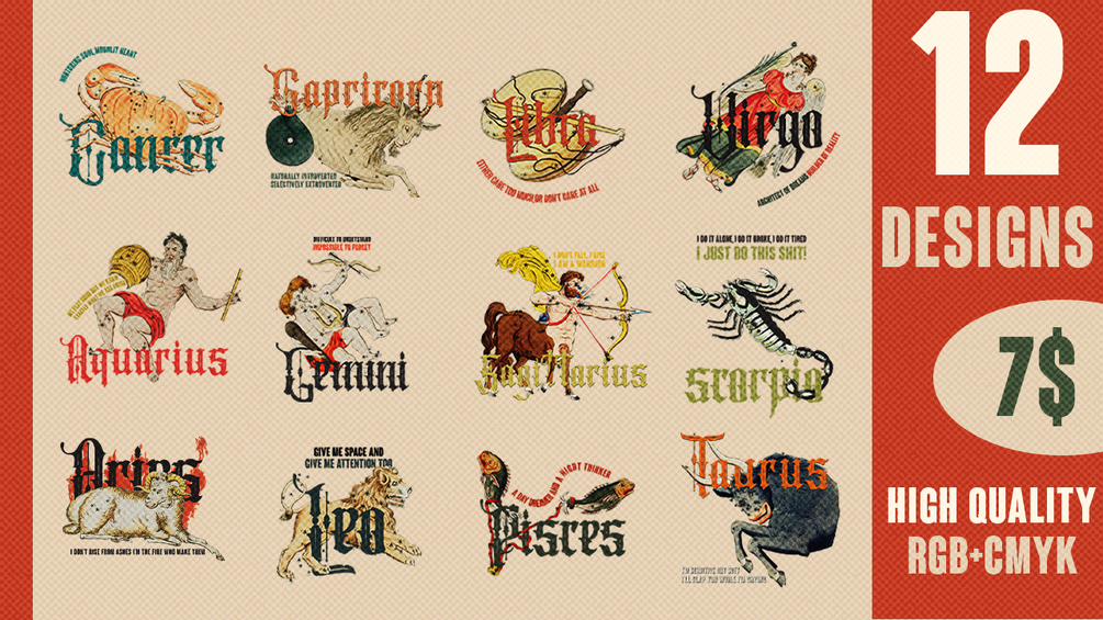You will receive 12 high-quality zodiac designs in PNG format, each image size being 5000x5000 pixels, the images are provided in both RGB and CMYK formats